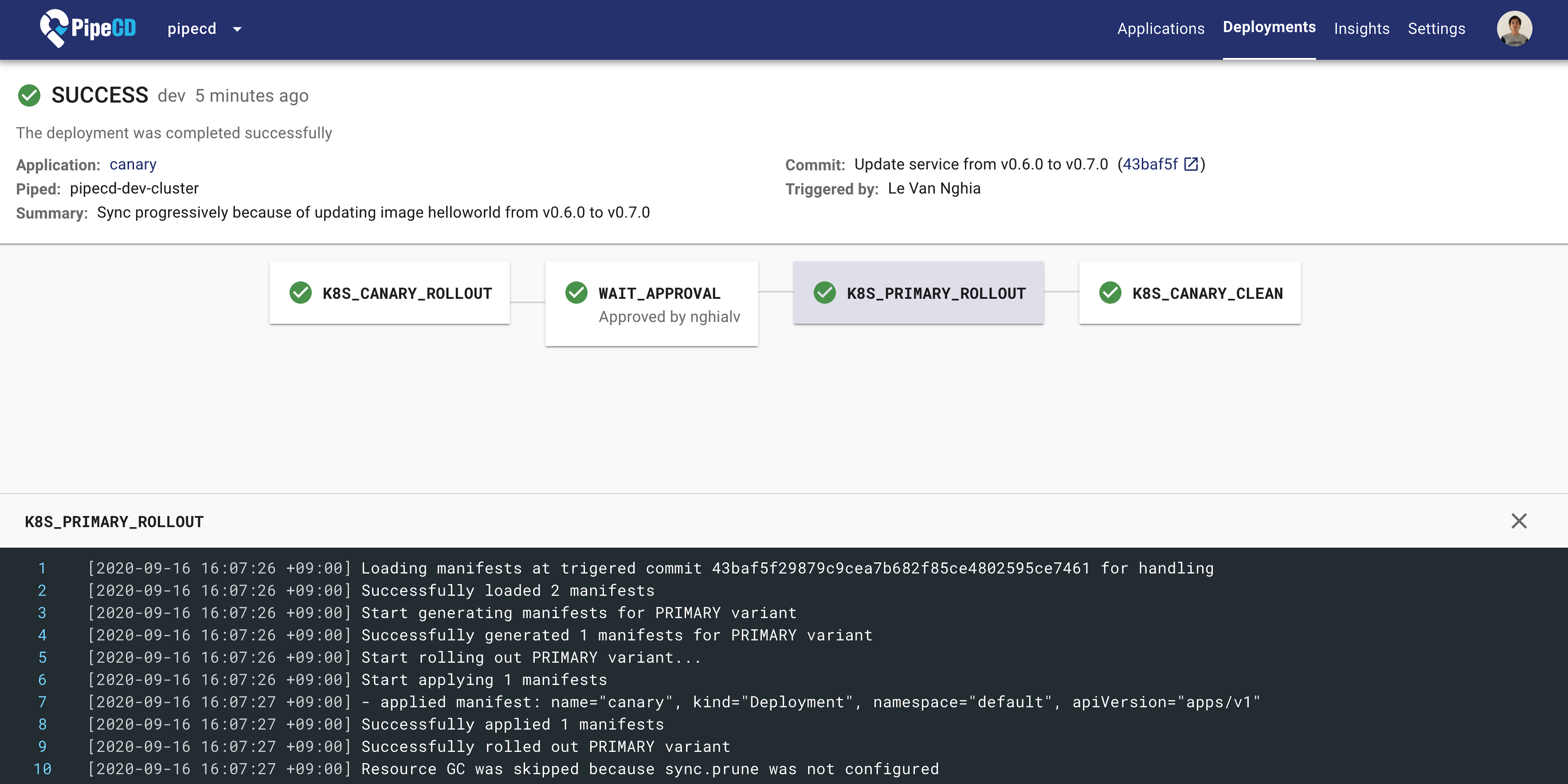 Visibility is one of the most requested factors we received when surveying engineers in our company. Visibility is the ability to see what’s going on in the cluster, the ability to see how each component of the application had been deployed, the ability to know quickly why the deployment was failed. Visibility for a team leader is the ability to know the delivery performance of the team and what metrics should be improved. With PipeCD, we always strive to maximize the visibility for engineers, operators as well as team leaders. Currently, it includes: