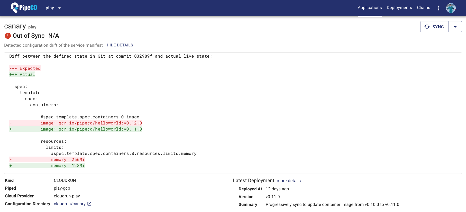 PipeCD includes the Configuration Drift Detection feature, which automatically detects the configuration drift and shows the result in the application details web page as well as sends the notifications to the developers.