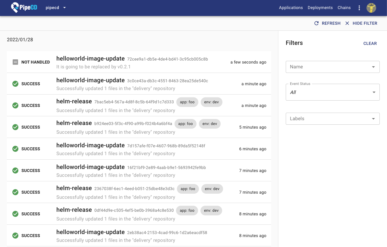 Checking the status of each sent event could be helpful for the developer while troubleshooting, so from v0.25.0 that page was added to PipeCD’s web console.