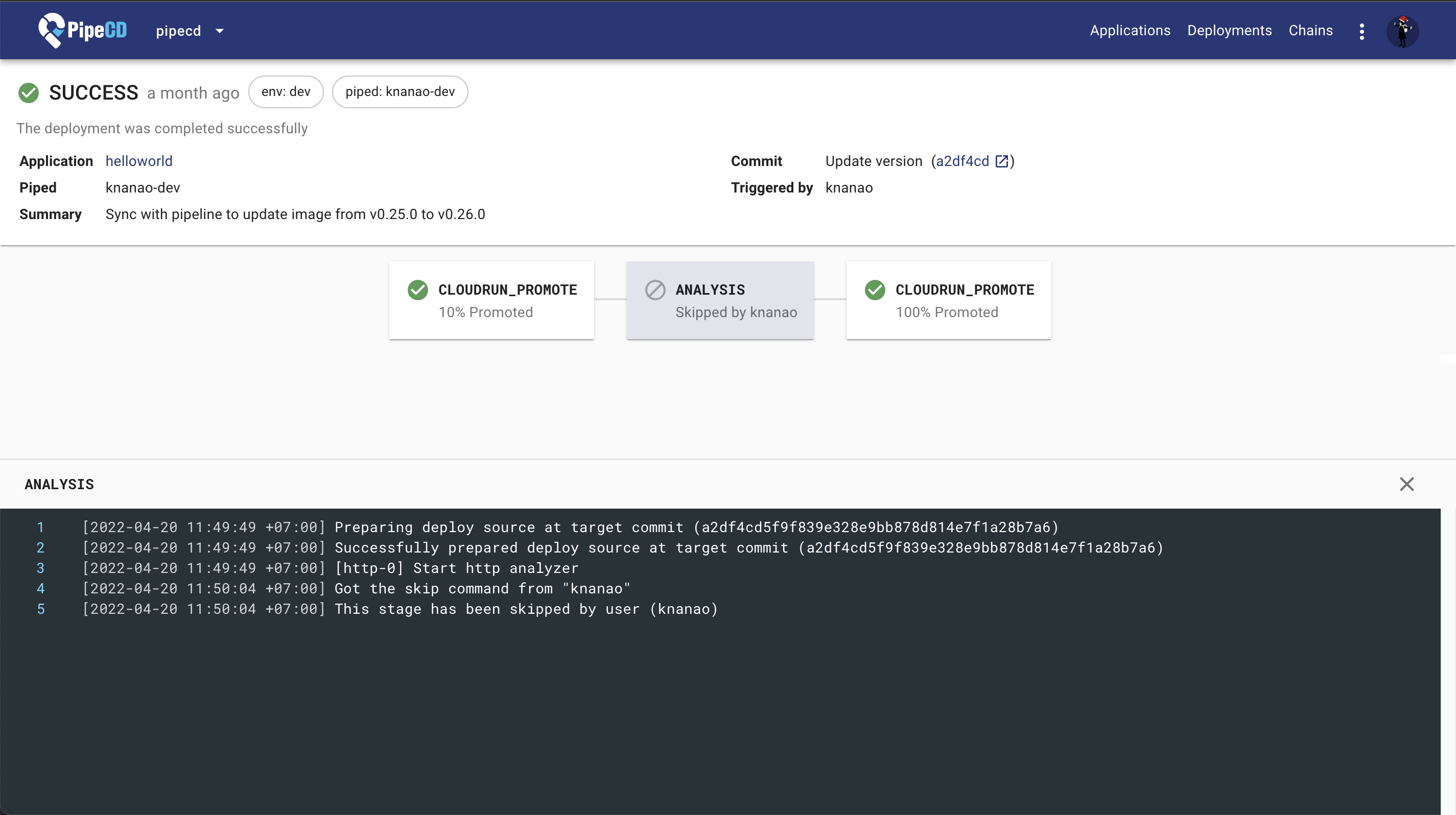One of the outstanding features PipeCD has is Automated deployment analysis (ADA), which helps you evaluate the impact of the current deployment right middle its running. Though it’s necessary to have that kind of stage for the stability of your service, sometimes you may want to skip the stage for some kind of quick/hot fixes. In that case, this feature is for you.