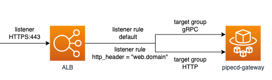 You must prepare two target groups for both HTTP and gRPC. Make two hosts and listner rules as below. Listner protocol should be HTTPS becuase it uses gRPC.