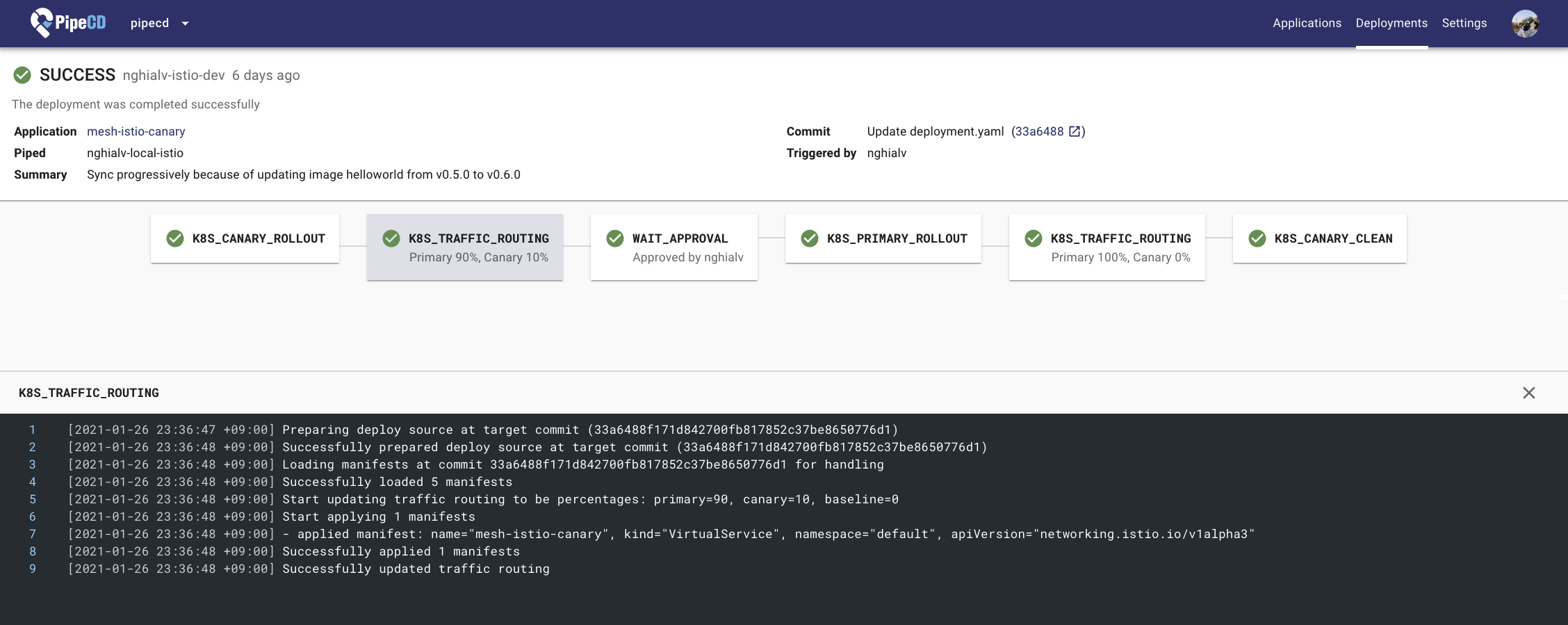 • Stage 2: K8S_TRAFFIC_ROUTING ensures that 10% of traffic should be routed to canary variant and 90% to primary variant. Because the trafficRouting is configured to use Istio, PipeCD will find Istio’s VirtualService resource of this application to control the traffic percentage.