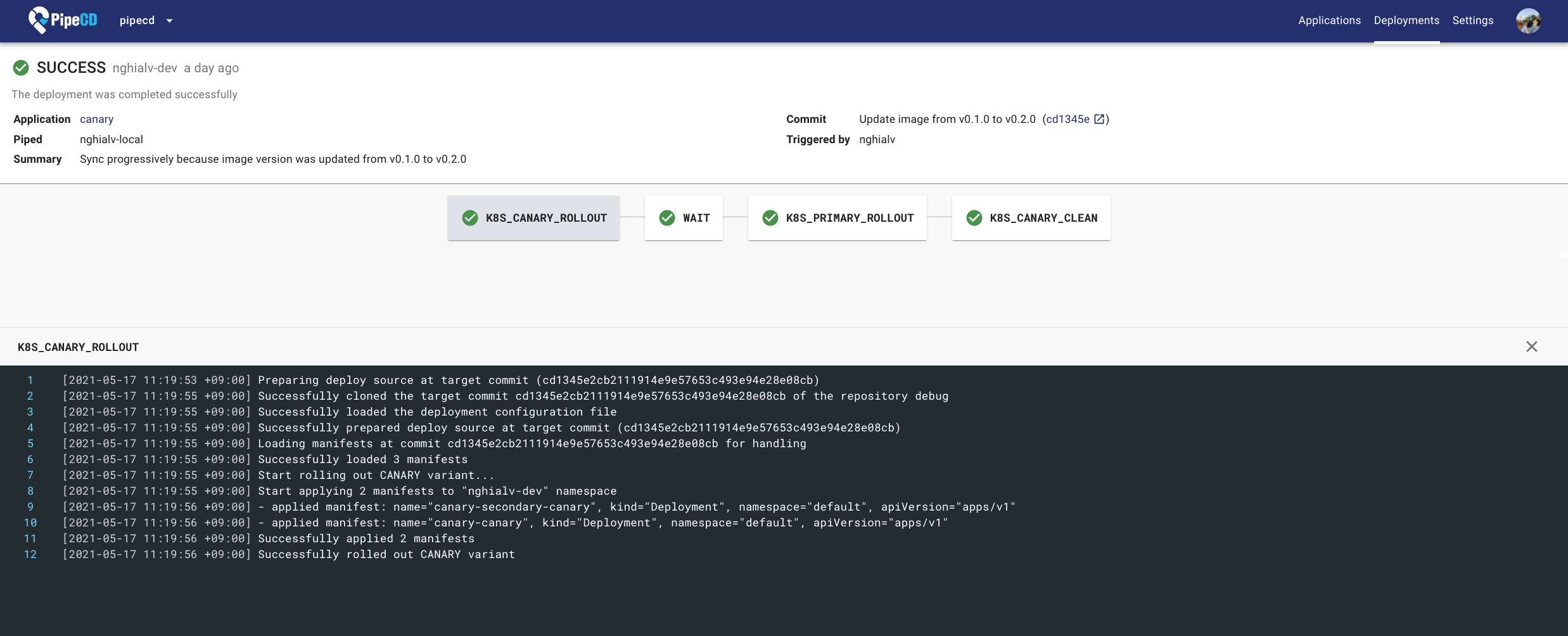 That is all, now let try to send a PR to update the container image version in the Deployment manifest and merge it to trigger a new deployment. Then, PipeCD will plan the deployment with the specified canary strategy.