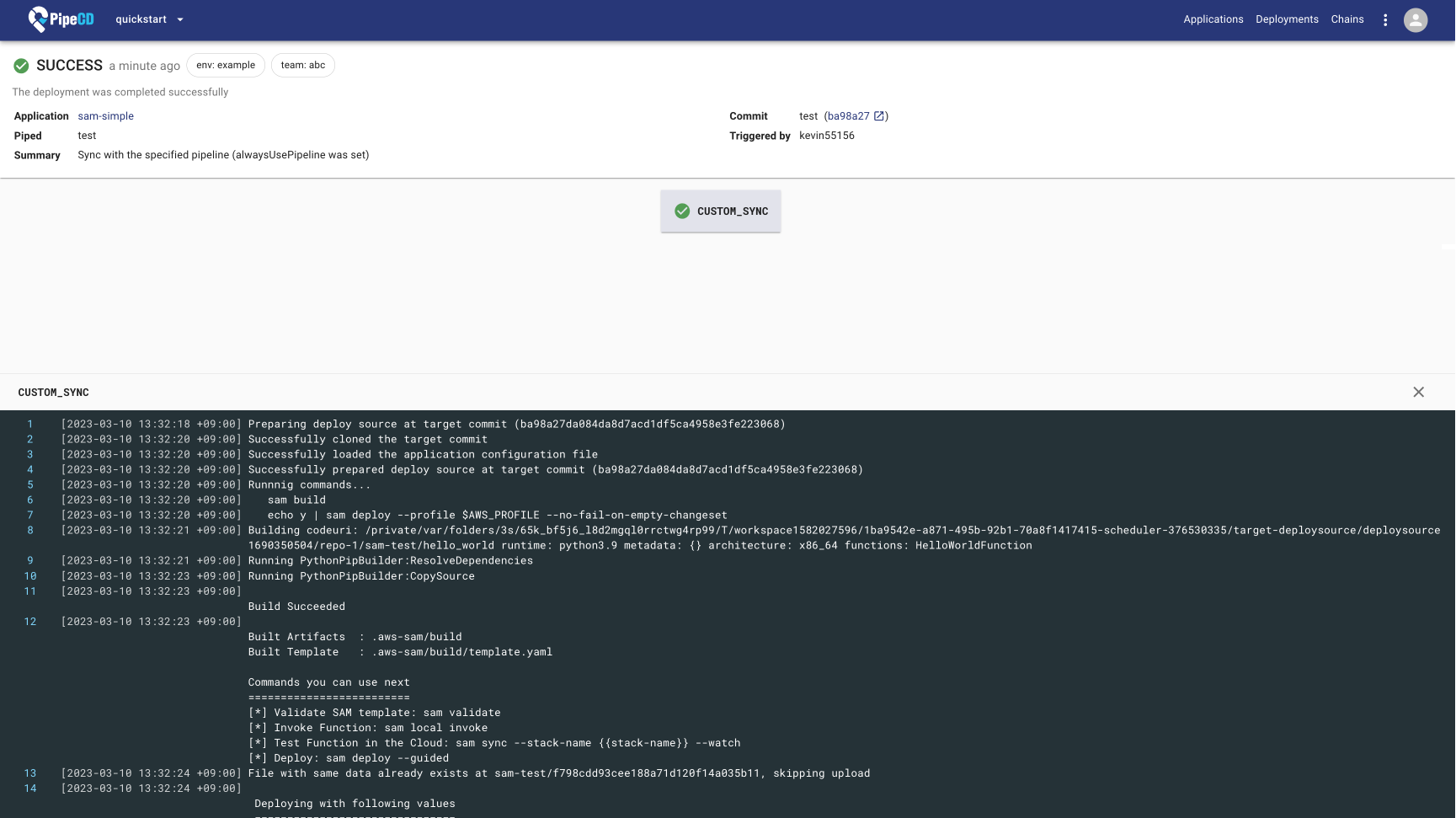 The public piped image available in PipeCD main repo (ref: Dockerfile) is based on alpine and only has a few UNIX command available (ref: piped-base Dockerfile). If you want to use your commands (sam in the above example), you can: