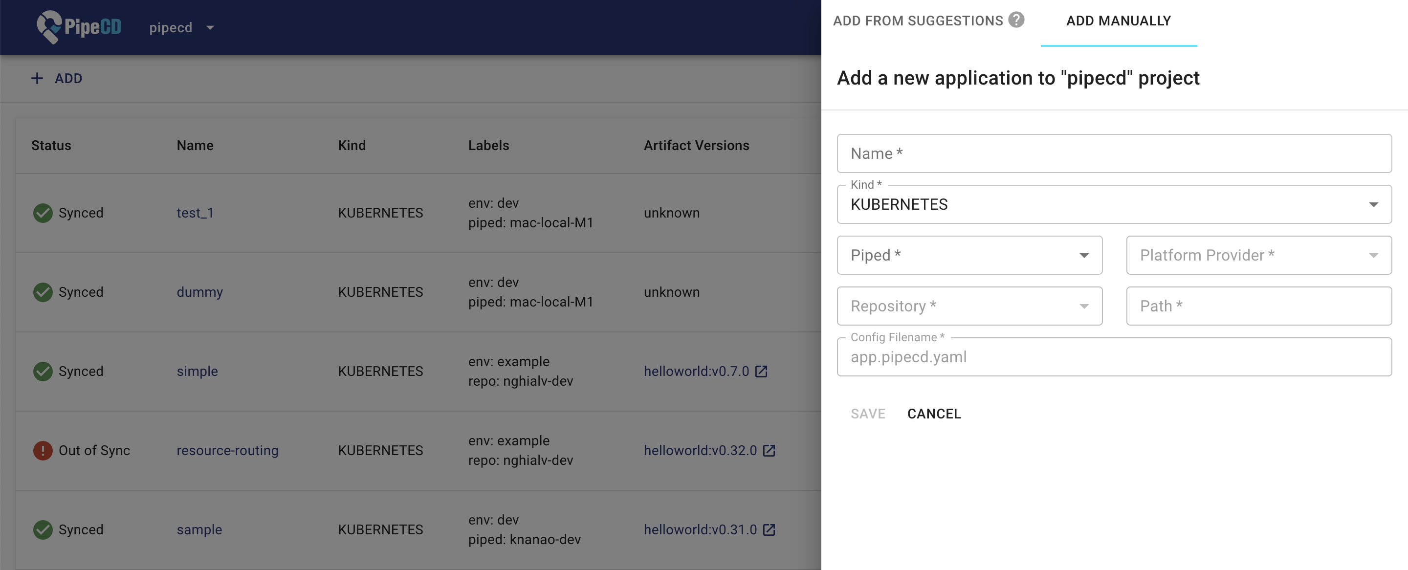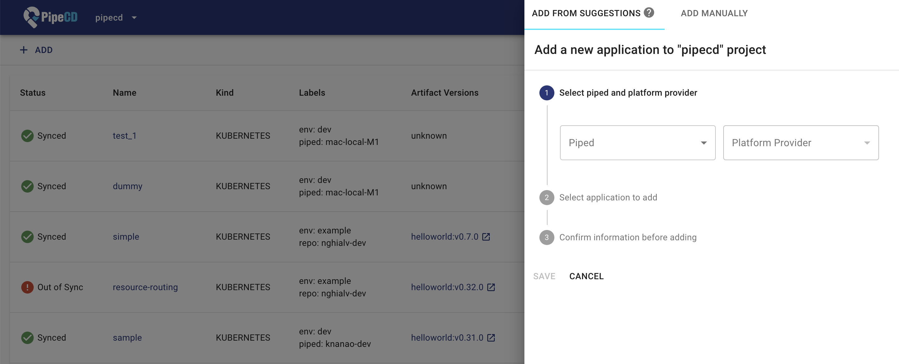 Select the Piped and Platform Provider that you deploy to, once the Piped that’s watching your Git repository catches the new unregistered application configuration file, it will be listed up in this panel. Click ADD to complete the registration.