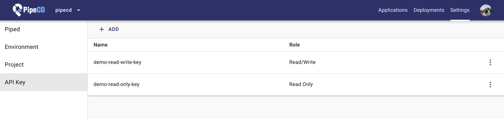 In order for pipectl to authenticate with PipeCD’s Control Plane, it needs an API key, which can be created from Settings/API Key tab on the web UI.