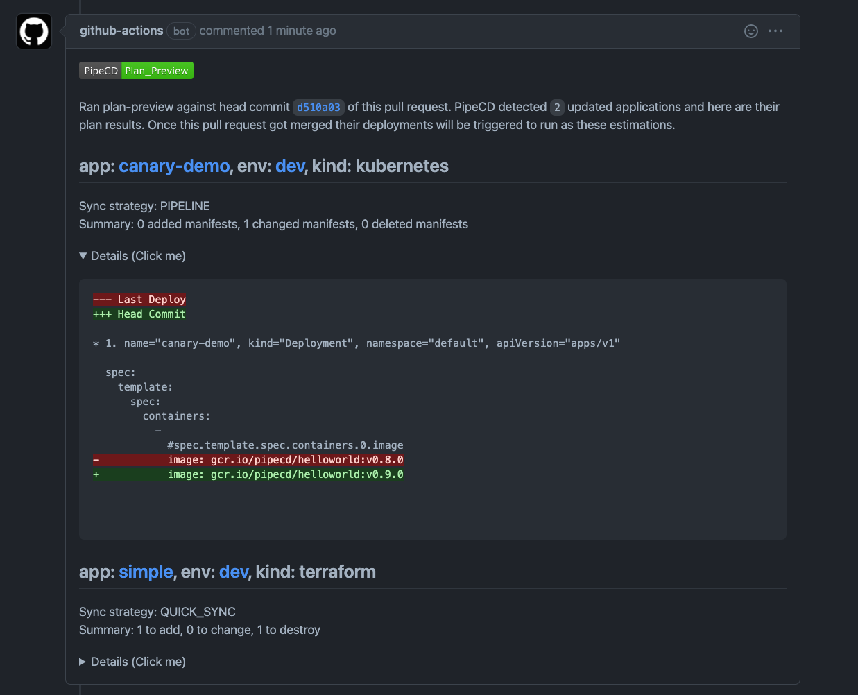 If you are using GitHub Actions, you can seamlessly integrate our prepared actions-plan-preview to your workflows. This automatically comments the plan-preview result on the pull request when it is opened or updated. You can also trigger to run plan-preview manually by leave a comment /pipecd plan-preview on the pull request.