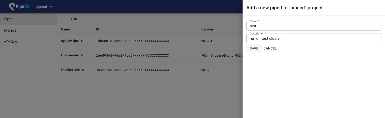 The list of piped instances are shown in the Settings page. Anyone who has the project admin role can register a new piped by clicking on the +ADD button.